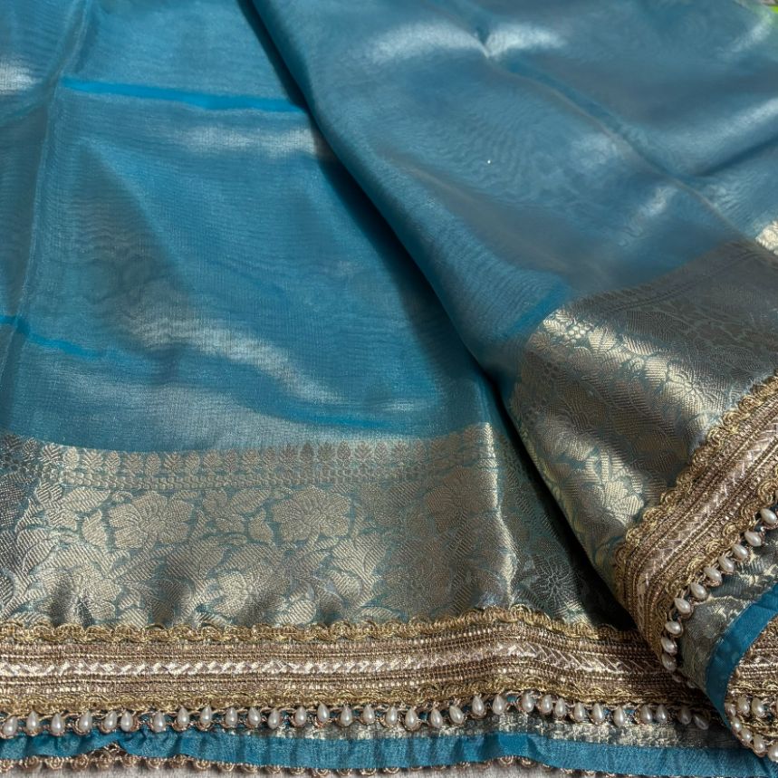 Janhvi Kapoor Inspired Aqua Blue Soft Tissue Silk Saree with Handmade Cutwork Laces