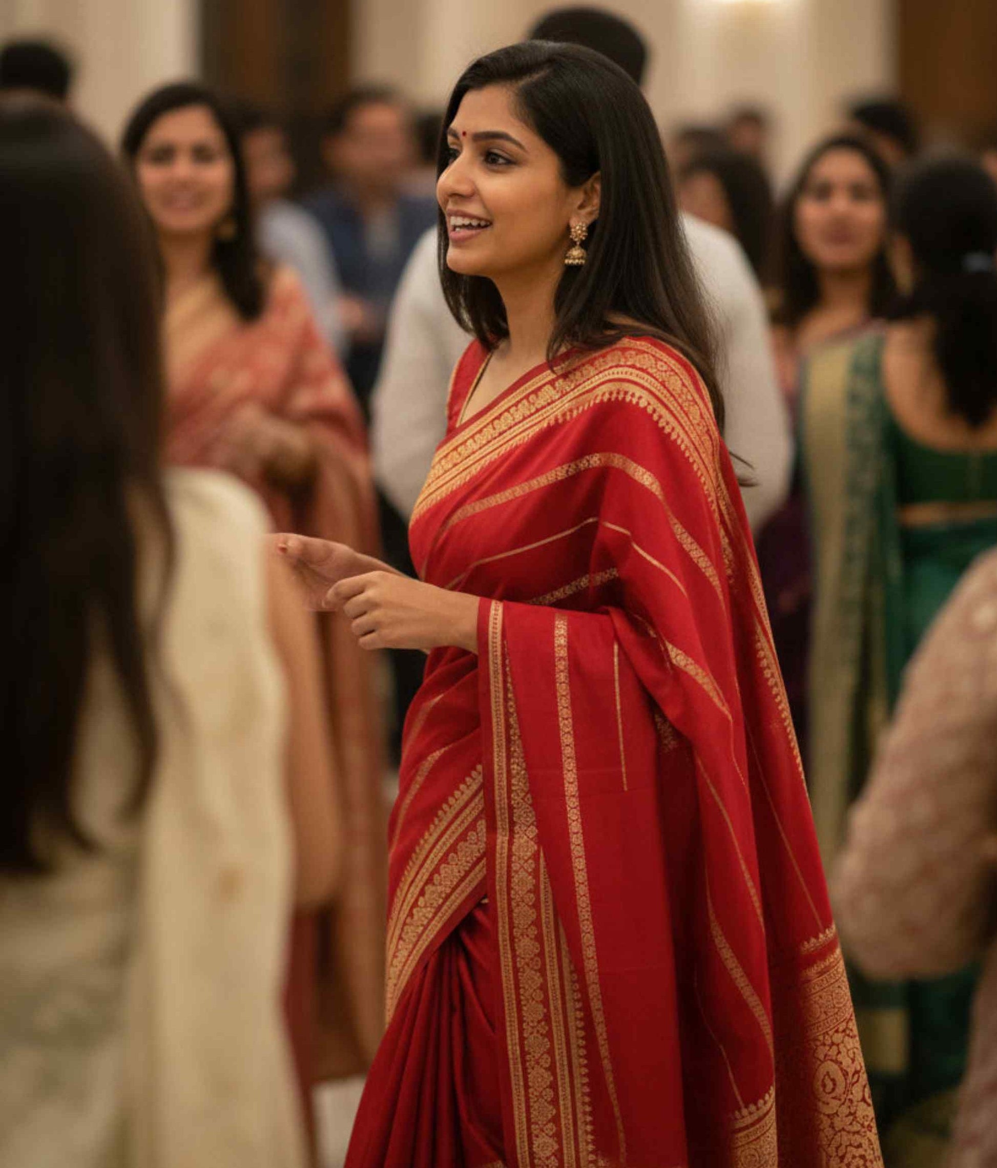 Crafted from authentic Mysore crape semi-silk, this elegant saree features a striking red base complemented by a luxurious golden jeri border and running plain blouse The richly embellished pallu adds a sophisticated finishing touch, making it an ideal choice for traditional occasions and celebrations.
