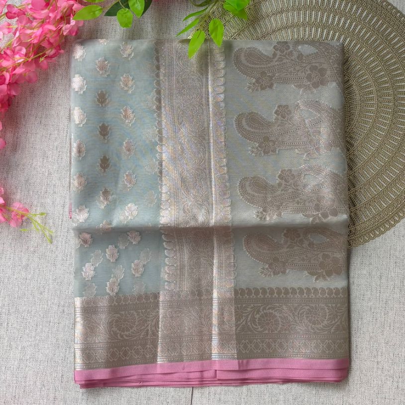 Grey Pink Banarasi Organza Silk Saree