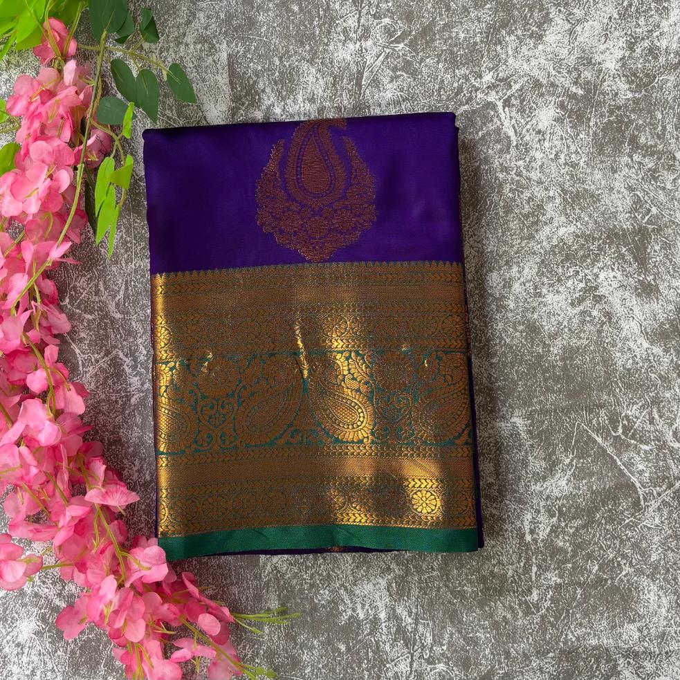 Elevate your ethnic wardrobe with this semi-Kanchi saree, featuring a striking purple and green border that frames the fabric beautifully. The saree showcases traditional mango motifs. Crafted with the characteristic weave of Kanchi silk. Perfect for weddings, festivals, and formal gatherings where refined taste meets traditional heritage.