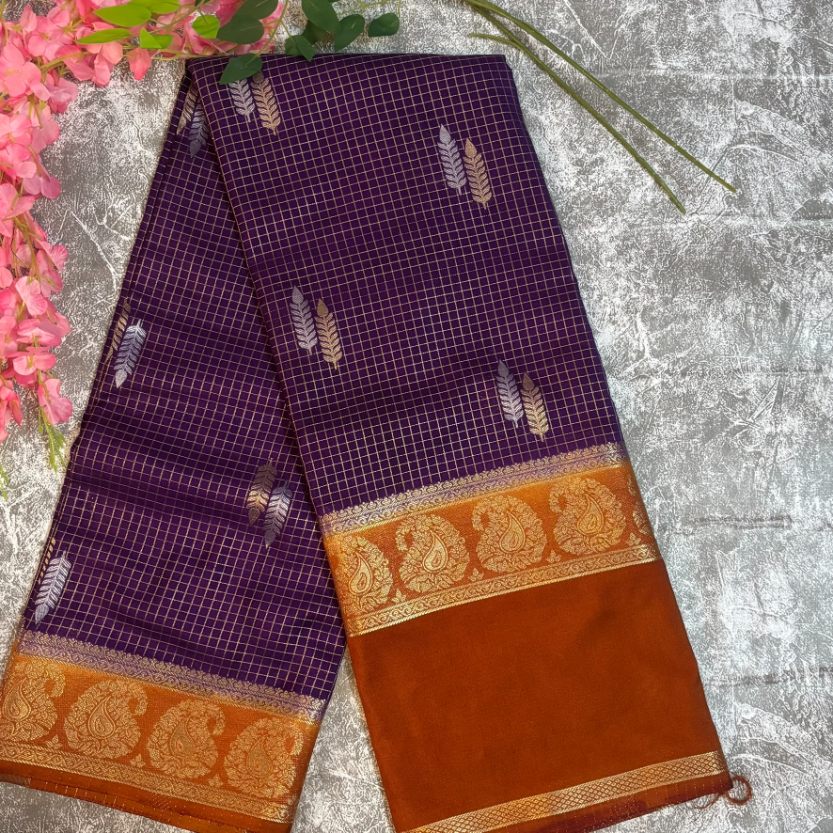 Elevate your wardrobe with this exquisite Mysore crape silk semi, featuring a sophisticated purple and rust orange small check pattern. Perfect for creating elegant sarees for occasion wear,