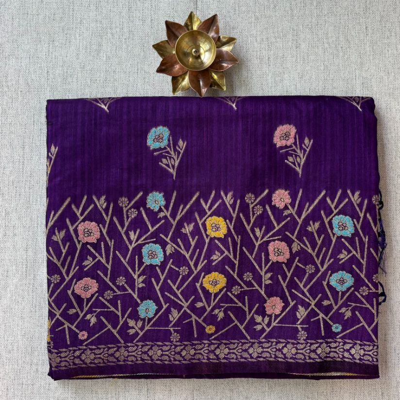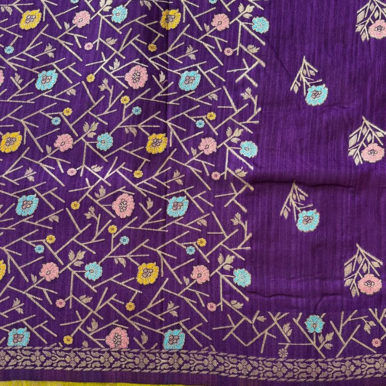 Purple Banarasi Raw silk with contrast lemon yellow blouse