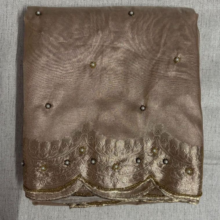 Elevate your ethnic wardrobe with this exquisite Soft Glass Tissue saree, meticulously crafted withl Aari handwork. The delicate scalloped border showcases intricate embroidery that catches light beautifully, Soft glass tissue fabric offers a luxurious sheen and comfortable wear for extended periods, making it ideal for weddings, celebrations, and formal occasions. The handwork detailing reflects artisanal craftsmanship, ensuring each piece is uniquely refined. Perfect for those who appreciate timeless elegance with contemporary comfort.