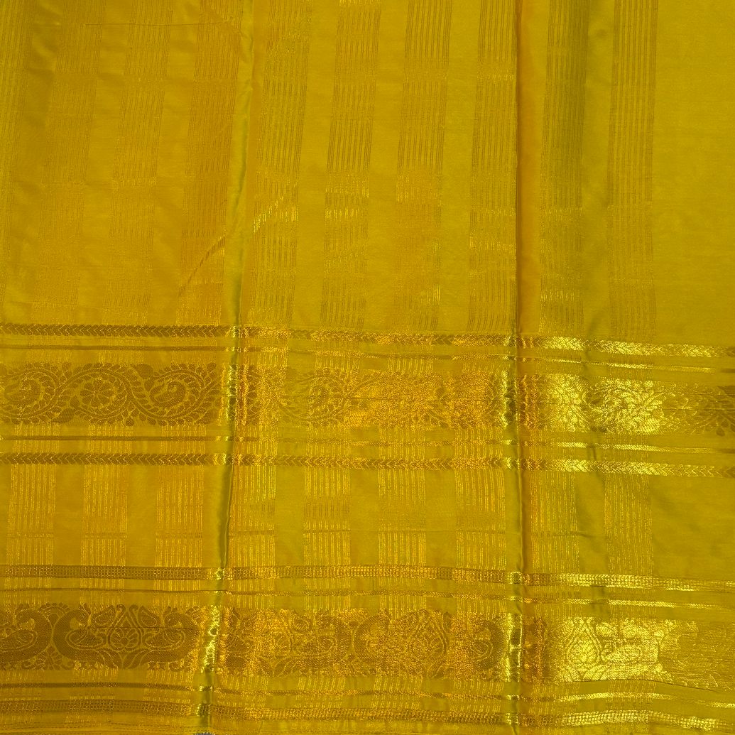 Yellow Premium Mysore Crape Silk Semi with Golden zari with Bentex Border. Ideal for festive occasions, celebrations, and formal gatherings, this semi-silk piece seamlessly blends traditional craftsmanship with contemporary styling. A versatile addition to any discerning wardrobe, offering both comfort and timeless appeal.